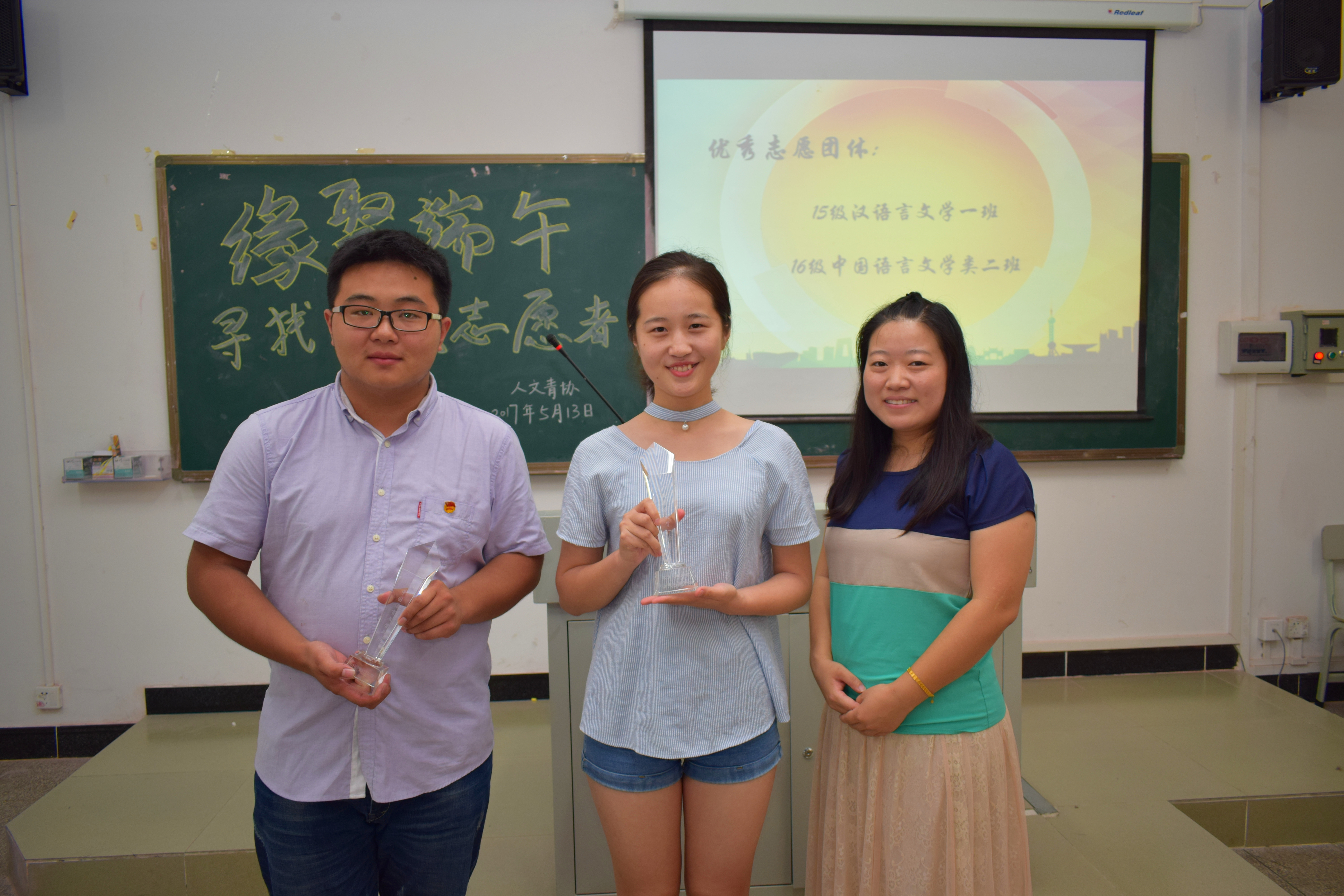 人文传播学院青年志愿者协会举办了“承青年之志,扬奉献之风”优秀志愿者及志愿团体表彰大会暨端午主题活动。2016级辅导员王俊延老师,院青年志愿者协会会长高少波参加活动。