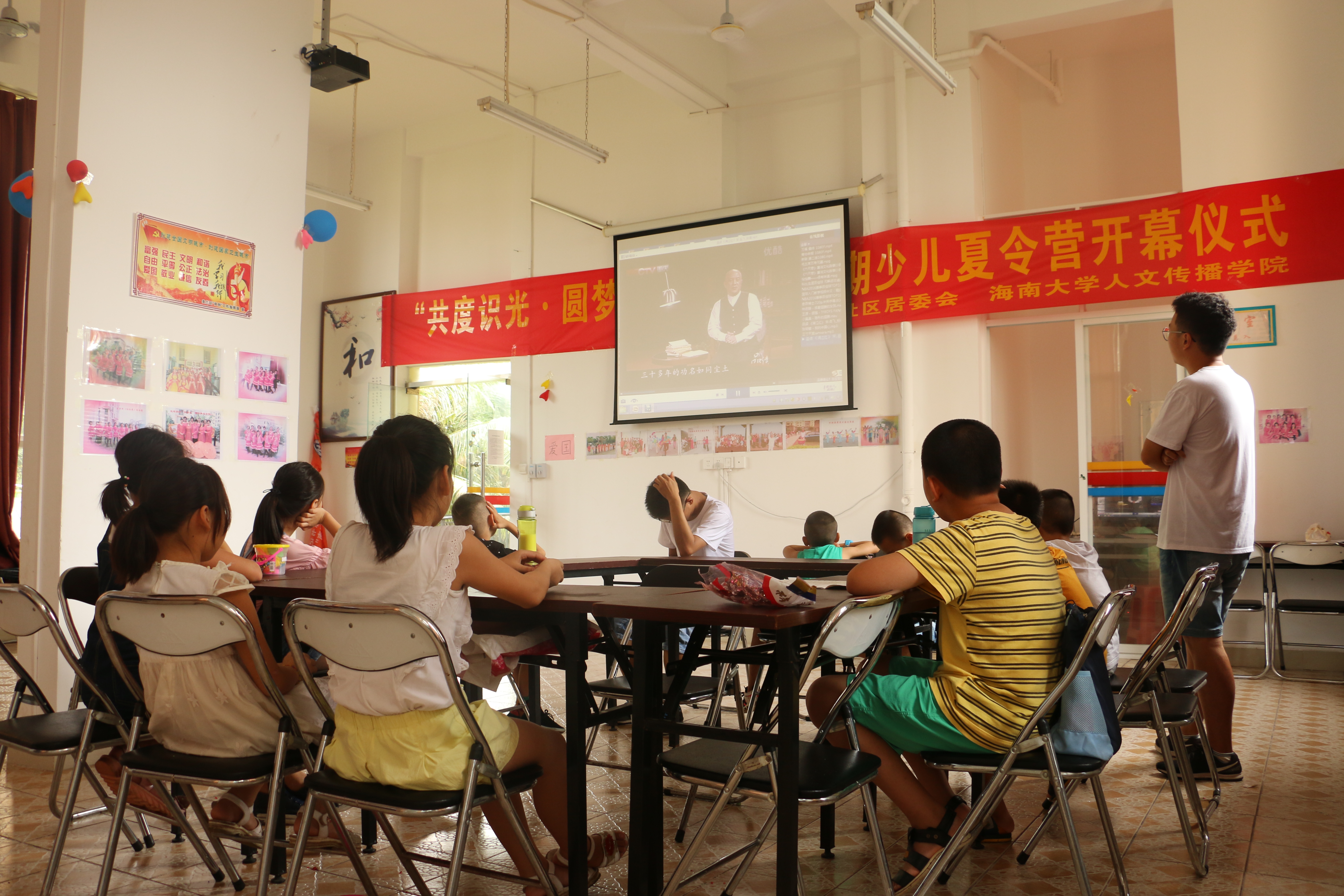每天上午9点不到,孩子们便来到了社区活动室,安静的在座位上完成暑假作业或做手工,等待着志愿者们开始教学。第一时段是朗诵课,教学内容大都以古诗名篇为主,通过介绍诗作背景并播放相关视频,孩子们对古诗有了更深入的理解。伴随着孩子们稚嫩而童真的朗读声,一天的活动就这样开始了。随后进行的是书法教学。志愿者从纠正孩子们的坐姿与握笔姿势开始,还有常用笔画的练习,孩子们都能在志愿者的带领下静心书写,在一笔一画中学习汉字的框架与结构,感受汉字文化的魅力。