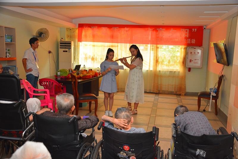 下午三点整,由主持人致辞,宣布敬老活动正式开始。第一环节,文艺活动。首先由志愿者带来民族舞表演,让老人们领略了舞蹈的魅力;随后志愿者的长笛独奏《没有共产党就没有新中国》和《喀秋莎》,勾起了老人们对往昔的回忆;志愿者们也为老人带来歌曲《宠爱》与《和你一样》,活动被推上高潮,气氛更加活跃;最后志愿者进行了重阳主题诗朗诵《采桑·重阳》,赢得了老人们的好评。同时,志愿者们节选了抗战题材纪录片《坚忍》进行展映,这不仅唤起了老人们对过往的回忆,也响应了“十九大”号召,向在场的志愿者们传达了“不忘初心,艰苦奋斗”的精神理念。第二环节,志愿者们向老人们分发精心准备的水果、香包,水杯等礼物,并与老人们交谈聊天。聊天过程中,有一位老人在志愿者面前落泪,向志愿者竖起大拇指。第三环节,由团委副书记王安祺作总结发言,她表示希望通过此次活动能够将敬老爱老的精神传递,能够有更多人从点滴小事做起,关爱老人。下午四点半,活动圆满结束。
