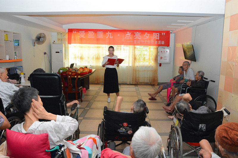 夕阳无限好,人间重晚情,重阳节到来之际,为弘扬中华民族敬老、爱老、助老的传统美德,营造重阳节的节日氛围。2017年10月28日,人文传播学院青年志愿者协会走进海口市L&C老年护理院,顺利举办了“爱盈重九·点亮夕阳”重阳节主题敬老活动。