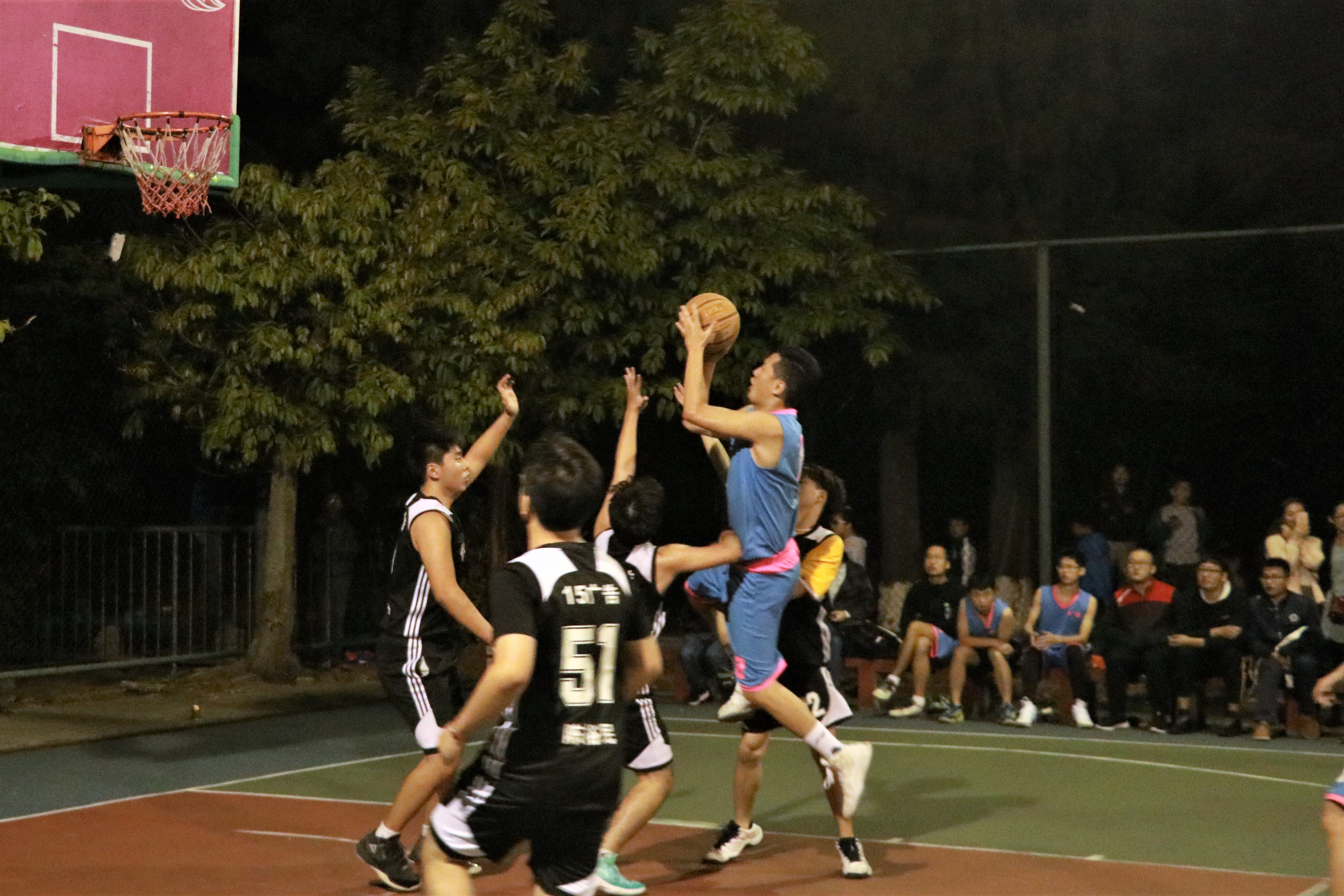 在短暂的中场舞表演后,男篮决赛正式开始,相较于女篮,男篮对抗更为激烈刺激,你来我往,攻守有方,第二节结束时双方比分为18比12,14广告获得暂时领先。第三节中15广告奋起反击,追平比分,随后双方比分陷入拉锯,场上所有人都绷紧了神经,每进一球都引起了阵阵尖叫。特别是在最后一分半时,双方球员们都使出了浑身解数,球在双方之间不断易主,吸引了大量行人驻足观看。最后,15广告队以48比42险胜14广告队。