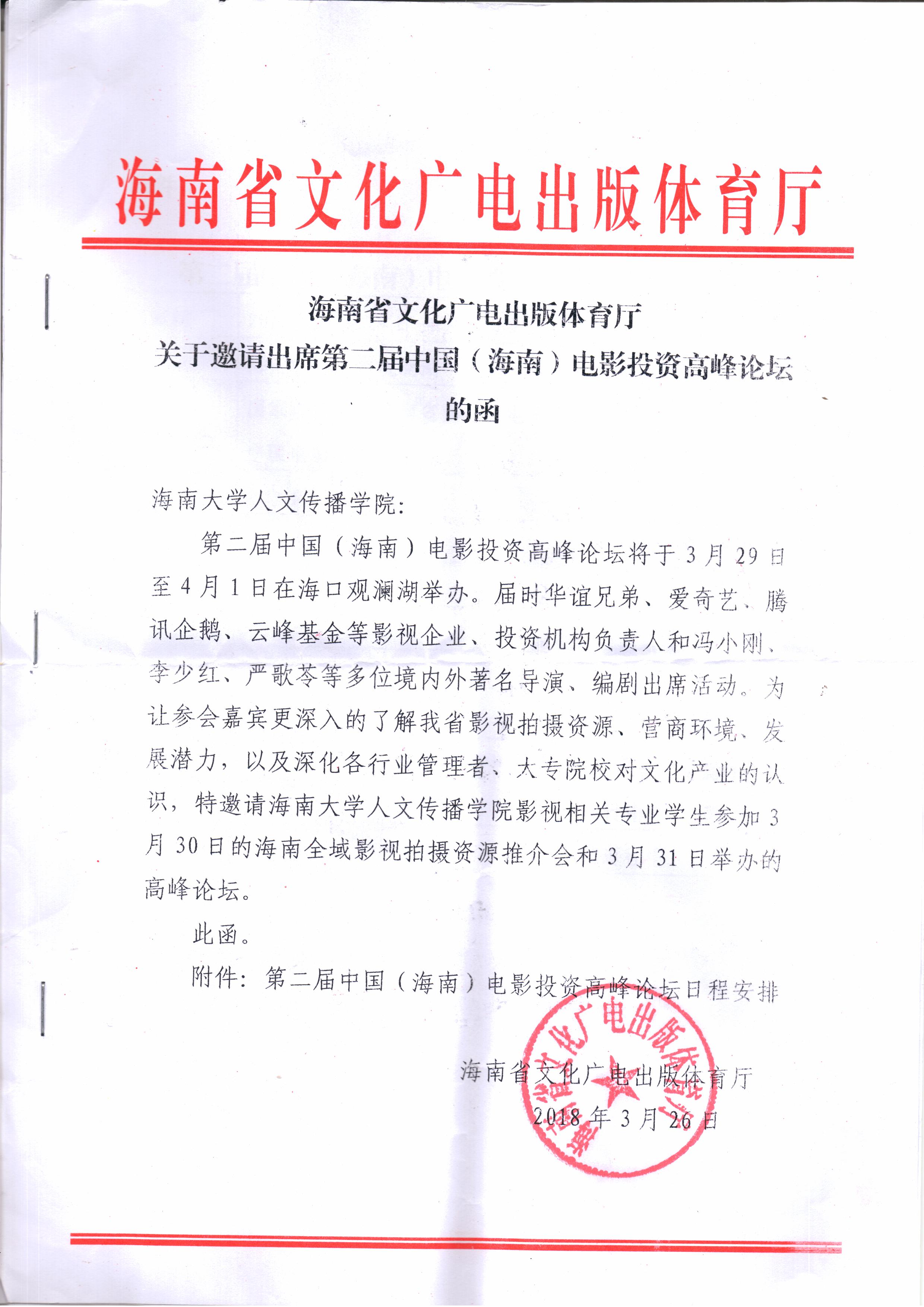 师生应邀参加。本次论坛由国家电影局、海南省文化广电出版体育厅、海口市人民政府、中国电影导演协会主办,中国电影股份有限公司、上海电影(集团)有限公司、华谊兄弟、博纳影业、云峰基金、华夏电影发行公司、阿里影业、腾讯影业、爱奇艺、乐视影业等企业和机构负责人参会,冯小刚、李少红、严歌苓、陈思诚、张歆艺、束焕等数十位著名导演、编剧、影评人出席。