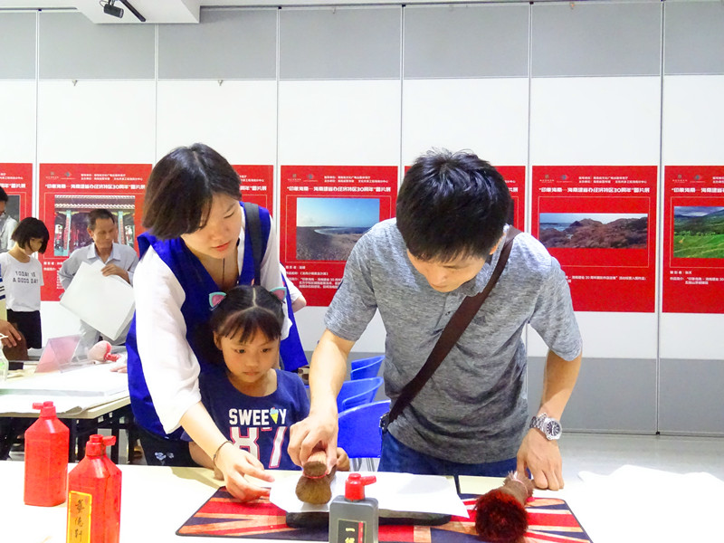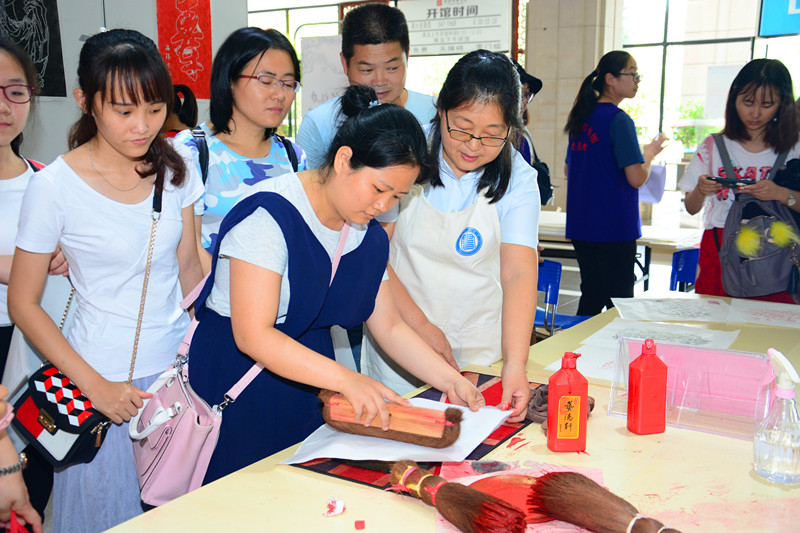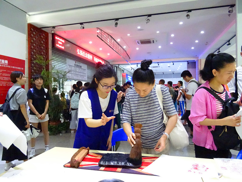 志愿者指导读者体验雕版印刷技术
