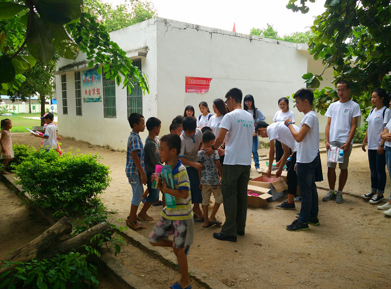 志愿者为孩子们发放学习用品