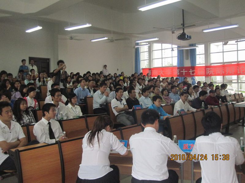 辩论赛主要分为开篇立论、攻辩环节、攻辩小结、自由辩论、总结陈词和观众提问六个环节。开篇立论中,正方一辩李禾臻紧紧围绕“知识是推动经济发展的原动力”这一核心观点阐明自己的立场,反方一辩则冷静透彻地用现实数据说明了海南岛建设急缺资金的现实,从而论证了该方观点。最为精彩与扣人心弦的就是自由辩论环节,正方二辩霍辉和三辩胡艳秋一热一冷相互配合,用充分的论据与精辟的论点与反方辩手展开了犀利地辩论。最后,评委就本场辩论赛的总体表现作了点评,肯定了选手们的辩论实力,并鼓励大家再接再厉。