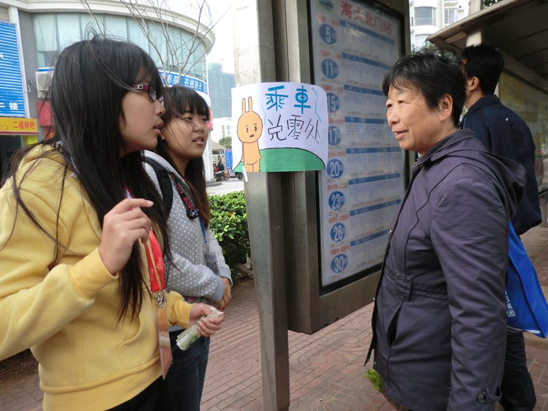北门、南门、东门外的公交车站开展“零钱兑换,便民出行”的志愿活动,意在减少以往乘客乘车缺少零钱的困境以及所导致的乘客擅自收费的不文明现象,净化海南省乘车环境。
