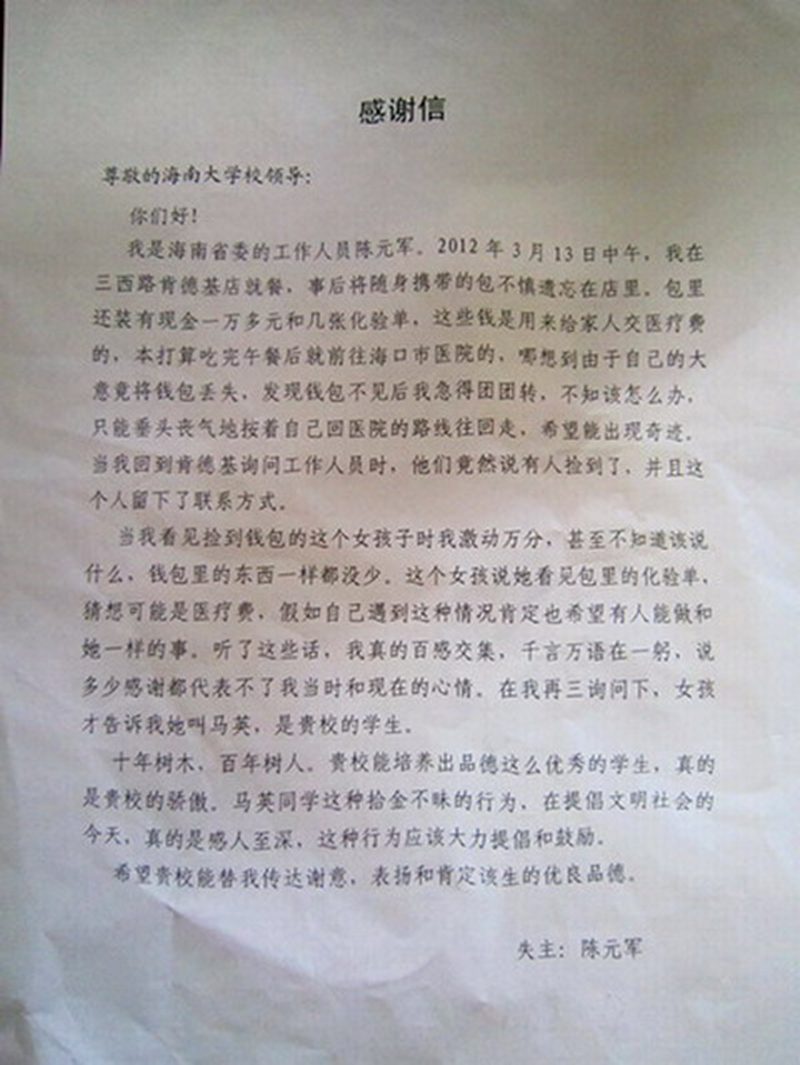 失主发来的感谢信