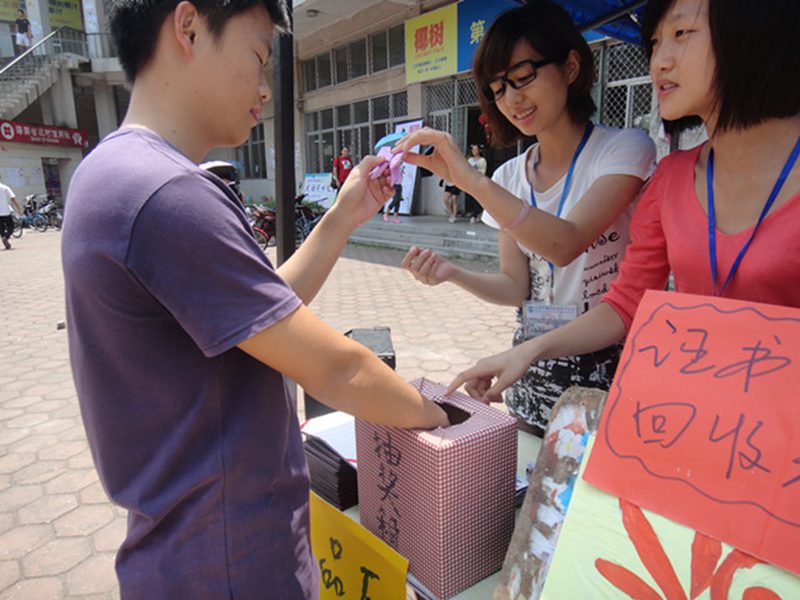 全体学生于4月21至24日四天在人流量高的二食堂门口开展了一次证书外壳有效回收活动。 本次证书壳回收活动以收取同学们不需要的荣誉证书外壳为主,活动中还设置了礼品赠送环节和抽奖环节,广大同学们积极参与,为文明大行动贡献力量。