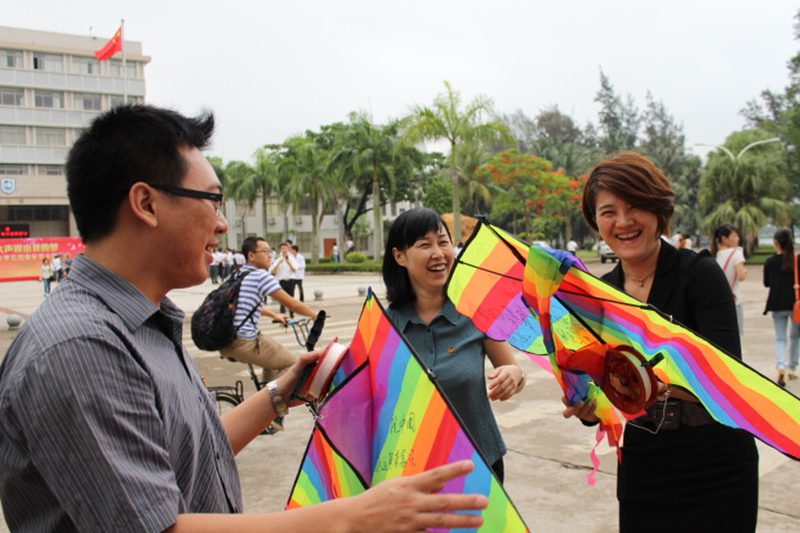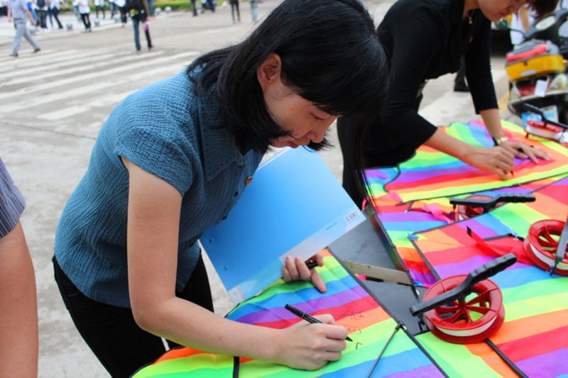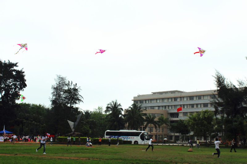 风筝文化节现场观摩指导,并在同学们赠送的风筝上写下梦想。人文传播学院党委孙晓媛副书记,学工办熊文军老师出席活动现场,与同学们一同放飞梦想。 本届风筝文化节共分“放飞青春梦想”、“风筝DIY比赛”、“风筝放飞比赛”、“青春梦想墙”几个环节。上午八点学校行政楼前升旗仪式结束后,在中国共产主义青年团团歌歌声中,随着100多只承载着青春梦想的风筝的集中放飞,拉开了本届风筝文化节的序幕。风筝DIY大赛是本届风筝节的一个亮点,广大同学围绕“中国梦”这一主题选用低碳环保的废弃材料,发挥想象制作出各种类型的风筝,引来众多海大学子的围观和点评。风筝放飞比赛把本届风筝文化节活动推向高潮,在孙晓媛副书记的一声令下,风筝放飞比赛正式开始。各位参赛选手拉着风筝奔跑在起点草坪上,七彩的风筝,青春的身影,响亮的笑声,为起点草坪增添了一抹独特的亮丽风采。风筝比赛结束后,参赛的同学们还把美丽的梦想粘贴在青春梦想墙上,展示着一个个五彩斑斓的梦想。孙晓媛副书记和熊文军老师分别为本届风筝节上“风筝DIY比赛”和“风筝放飞比赛”的获奖选手颁奖。 本次风筝节活动寄托了灵犀直播