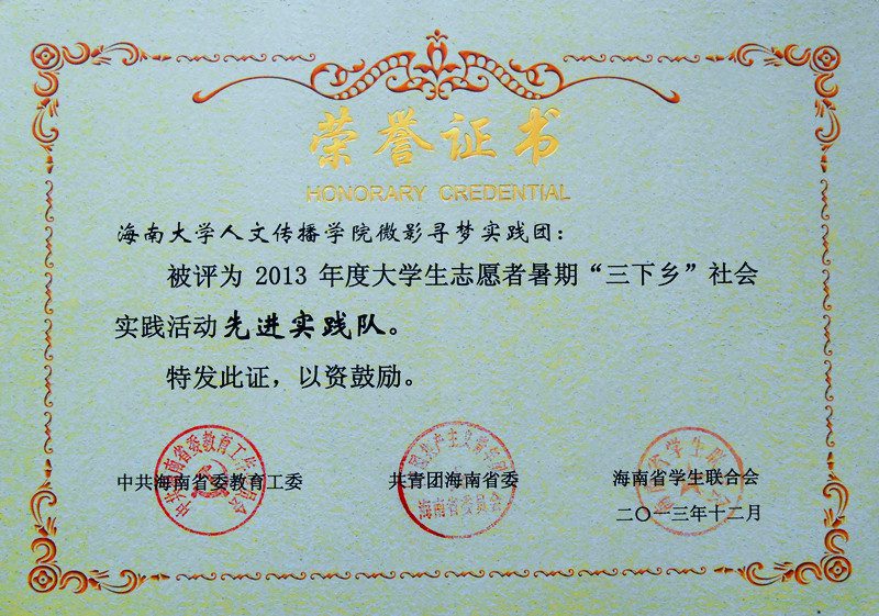 以2012级广告学专业陈伟兴同学为队长的“微影寻梦”实践团队荣获海南省2013年度大学生志愿者暑期“三下乡”社会实践活动先进队荣誉称号,2011级广告学专业毛占潇、谢琳、王曦三位同学撰写的暑期社会实践论文《关于海南省旅游形象的调查研究》获得了海南省 2013 年度大学生志愿者暑期“三下乡”社会实践活动优秀调查报告(论文)二等奖,2010级戏影专业宋子琛同学被评为海南省 2013 年度大学生志愿者暑期“三下乡”社会实践学生积极分子。 “微影寻梦”实践队于7月2日—8月24日间赴琼中摄制微电影,以期揭示“琼中女足”的精神风貌。实践队员全部为灵犀直播