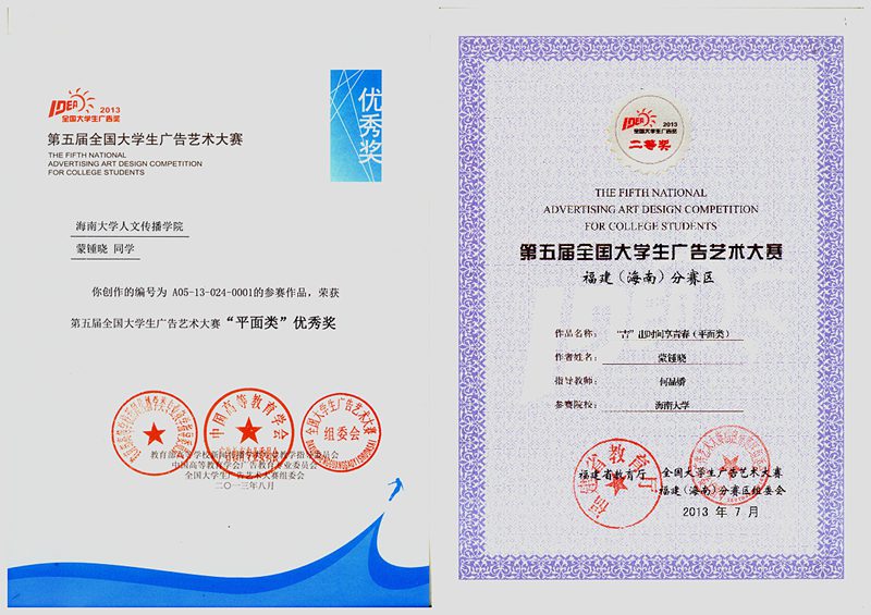 在岁末辞旧迎新之际,新传系学子捷报频传。7名同学在第五届全国大学生广告艺术大赛(大广赛)斩获佳绩,获得涉及平面类、微电影类的3个奖项。这是对新传系全体师生默默耕耘的肯定,更是鼓舞士气,越战越勇的一针强心剂。 全国大学生广告艺术大赛——中国最大的高校传播平台,是由教育部高等教育司主办、教育部高等学校新闻学学科教学指导委员会组织、中国传媒大学与中国高等教育学会广告教育专业委员会共同承办的唯一全国性高校文科大赛。是迄今为止全国规模最大、覆盖院校最多、参与师生人数最多、作品具有极高水准的国家级大学生赛事。参赛作品分为平面类、影视类、微电影类、动画类、广播类、策划类、公益类。参与选题企业有贝克药业、王老吉、中国大学生在线等全国知名企业。 在第五届大广赛中,新传系学子作品从数万件参赛作品中脱颖而出: