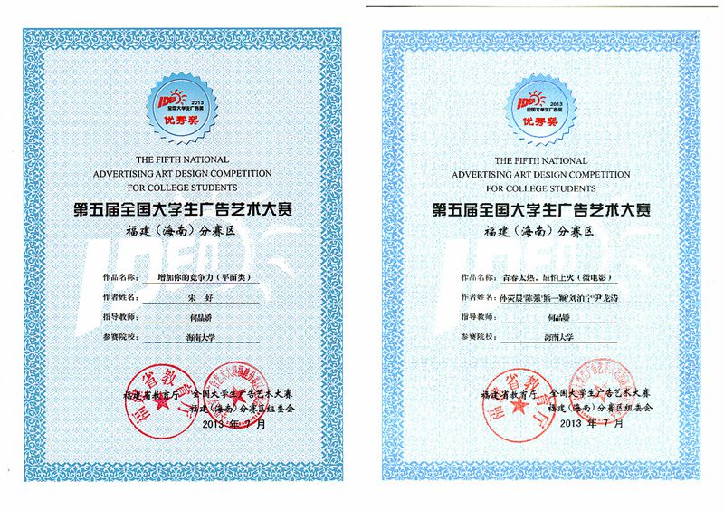 孙荧晨、陈强、熊一颖、刘泊宁、尹龙涛(12广告1班)《青春太热,最怕上火》荣获微电影类福建赛区优秀奖,指导老师:何晶娇。 大广赛对广告专业的学子来说意味着什么?“那是从事广告专业学子心中的奥斯卡,是精英学子同台竞技的最高平台。”获得全国优秀奖的蒙锺晓同学难掩心中的喜悦,“真的没想到能够获奖,我觉得新传系开设的课程给我了很大的帮助。PS设计、图形创意与设计、素描,这些课程打开了我的创意思路,谢谢老师们的悉心教导。”据悉,新传系的课程涵盖范围广,兼顾擅长文案策划、创意设计两类同学的需要,关注同学们的全面发展和个人特长的发挥。“当然我也想感谢自己一直以来的坚持,想创意、做设计经常加班加点,不过看到周围的同学都和我一样努力,我就更加不能懈怠,更要加紧脚步朝梦想前进。” 新传系广告专业是一门紧跟时代潮流,紧随市场动态,实战性极强的专业。大广赛有全国知名商家参与,从商业和专业的角度检验广告专业学子的实战能力。通过本次比赛,新传系学子跳出了书本的象牙塔,站在了实战的大舞台,真正像一个广告人一般打破常规,精益求精,加班加点,乐在其中。“脚踏实地,仰望星空”是新传系系主任何晶娇老师对新传系学子的殷切期待,期待同学们以创意为马,用实战扬鞭,积极、大胆地参与大广赛等高校顶级赛事,抓住知名广告主、专业广告人提供的实战机会,秀创意、展风采,来年再创新辉煌!(文字:孙荧晨)