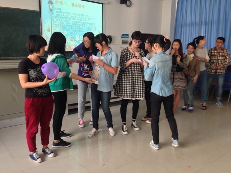 心理健康活动月各项活动进行推广。随后,王俊延老师发表简要讲话,并鼓励同学们积极参加心理健康教育活动月的各项活动。 活动中,雷慧同学通过一则心理测试,调动起现场气氛。紧接着,雷慧同学引导同学们开展了“自爆王”、“几块钱”、“扮时钟”、“时间分割”等游戏。通过形式多样的游戏活动,锻炼同学们的团队协作能力,引发同学们思考自己的学习生活。同学们积极参与活动,现场气氛热烈。游戏结束后,雷慧同学通过播放视频短片,向同学们普及了心理健康基本知识,为同学们解决学生过程中的心理健康问题提供参考。 此次活动,增进了班级同学的友谊,提高了班级同学们的心理健康知识水平,为同学们的健康快乐成长、顺利完成学业奠定基础。祝愿12级对外汉语班全体同学在以后的学业发展上取得更好成绩,生活更加愉快!