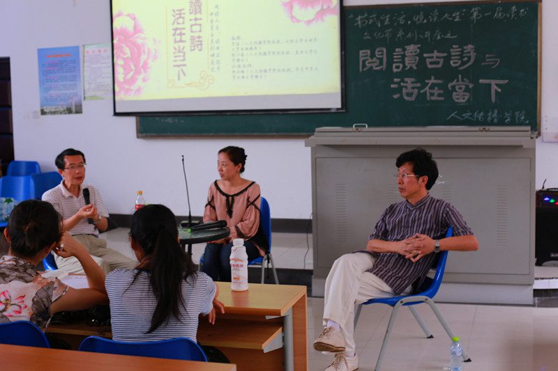 4月29日下午15:00,人文传播学院“书式生活,悦读人生”读书文化节之“阅读古诗与活在当下”读书沙龙活动在4教203如期举行。本次沙龙活动旨在增强同学们对古代传统古诗词的认知度,提高大家阅读和学习古诗词的兴趣,使同学们将中国古代优秀传统文化与现代社会紧密相结合。莅临沙龙活动嘉宾有人文传播学院李溢教授,张江南副教授;人文传播学院仲冬梅副教授主持本场沙龙活动。学工办熊文军老师也参加了本场活动。 活动开始前,主持人仲冬梅老师作了“阅读古诗与活在当下”的简要发言,作为古典文学老师,仲老师提出了自己对于古典诗词的理解与看法,随后由张江南老师发言,张老师虽然是西方文学的研究者,但他却认为自己在不断与西方诗歌的接触中深感与其是疏离的,即使可以感受到它所表达的情感,但却很少能产生文化根性意义上的体验与共鸣;他提出中国人始终都保持着一份属于自己的独立品性,古典诗词以它独有的韵律与味道熏养出我们的文化品性。接着李溢教授围绕这个话题做了动情的发言,他提到中国的古诗词有其特有的“风度”“气质”与“魅力”,它是一种说不出的美,是古人的一种生活方式,在与日本文学的比较中他深刻的阐述了一个观点:中国文化的博大精深是其他文化所不能及。仲冬梅老师在总结中提出了如果说中国的文学是美与善的文学,那么西方文学则是真与美的文学,它们看似区别不大,但是仔细琢磨,中国的古诗词是诗人的一种情感诉求,活在当下也就是活在历史中,从历史当中不断地审视自己,正视自己,努力培养自己的独立心灵,阅读古诗从而对自身的生命加以审视。老师们独到的见解,让参与活动的同学听到了思想的交锋与碰撞,同时也引听众投入其中。 活动还单独抽出半个小时的时间和听众进行互动交流。围绕主题,现场的同学向三位老师提出问题,老师们进行了一一解答,将阅读古诗如何与当下生活相联系提出了自己的见解与看法,他们指出阅读古诗是在追本溯源中直接与历史对话,而活在当下则是从阅读古诗的体悟中汲取营养,获取当下的力量,老师们的耐心解答使在座的同学都受益匪浅。 腹有诗书气自华,最是书香能致远。中华传统古诗词经久不衰,历久弥新,在当今社会它将会洗涤我们的思想,净化我们的灵魂,让我们阅读经典诗词,更好的活在当下!