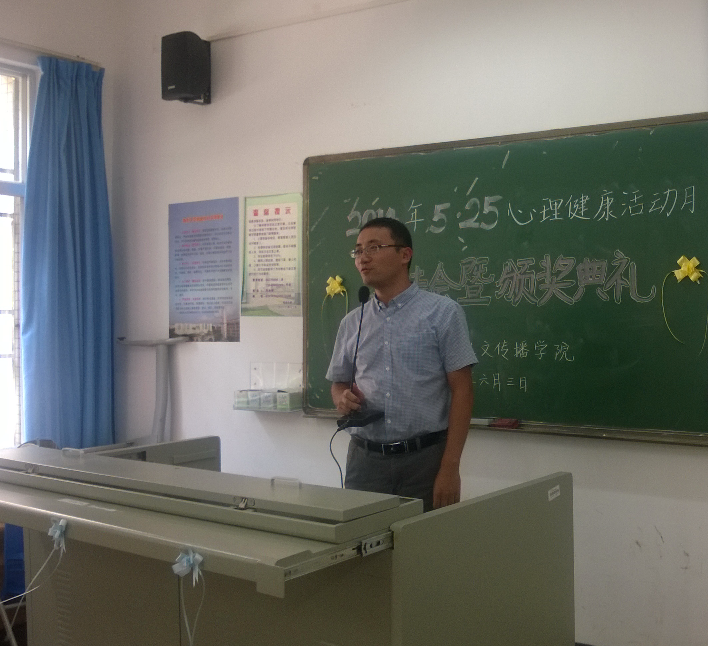 人文传播学院5?25心理健康活动月总结会暨颁奖典礼在5号教学楼115教室如期举行。人文传播学院学工办主任公衍峰老师和辅导员王俊延老师出席了本次活动,心理工作部庄绍斌同学担任主持,团委心理工作同学与灵犀直播