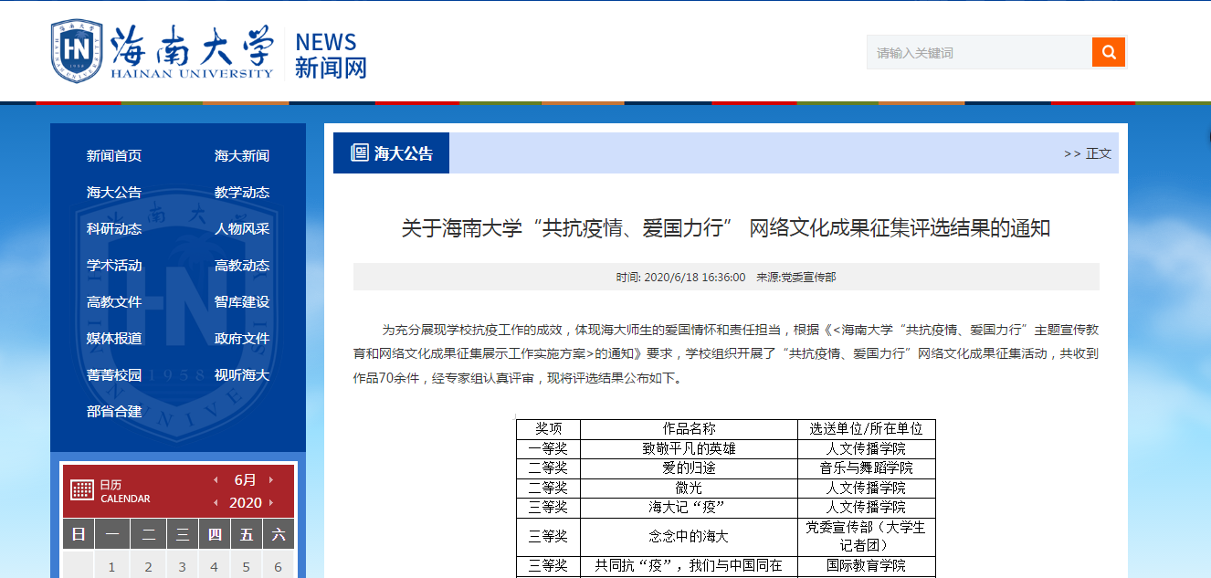 师生发挥学科和专业优势,充分挖掘身边抗疫先进典型事迹,抒发抗击疫情期间值得铭刻在心的坚守、奋战与感动,本院师生在学院党委的组织下踊跃参与,围绕着学校疫情防控的各类措施及成果积极进行记录和创作,在人文关怀和爱国热情的共同感召下,创作出了一大批优秀的主题作品,充分体现了学校和学院对于打赢疫情阻击战的决心和努力。