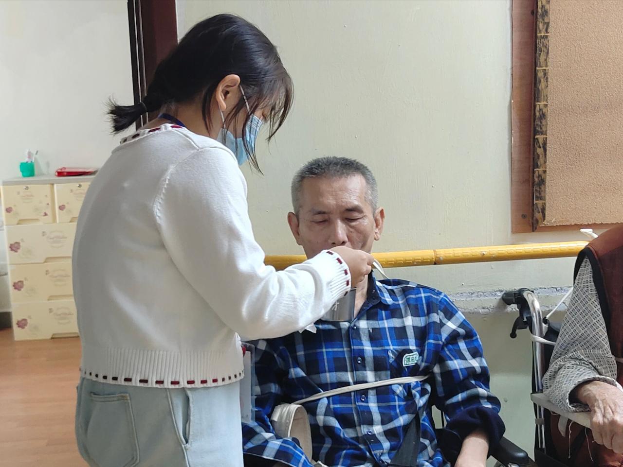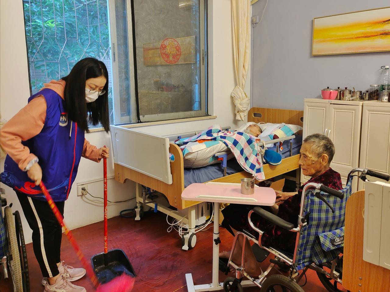 在此次活动中,志愿者们分成三组,分别在爱至家的三个楼层进行敬老爱老活动。活动期间,志愿者们陪老人聊天散步、帮老人按摩、清扫老年护理院以及整理物资。在护工的指导下,志愿者们学习护理技巧,照顾卧床老人。部分海南本地的志愿者用本地方言与老人聊天,回忆起年轻趣事的老人露出了孩童般的笑容;高龄的退休医生高唱国歌,用苍老的嗓音诉说拳拳爱国心。后期大批物资送至老年护理院,志愿者们分工合作,流水线式地清点、输送和整理物资。在整理物资期间,有几位老人的孩子来到护理院看望他们,即使父母与子女距离再远,牵挂彼此的心总是能拉近双方的心理距离。