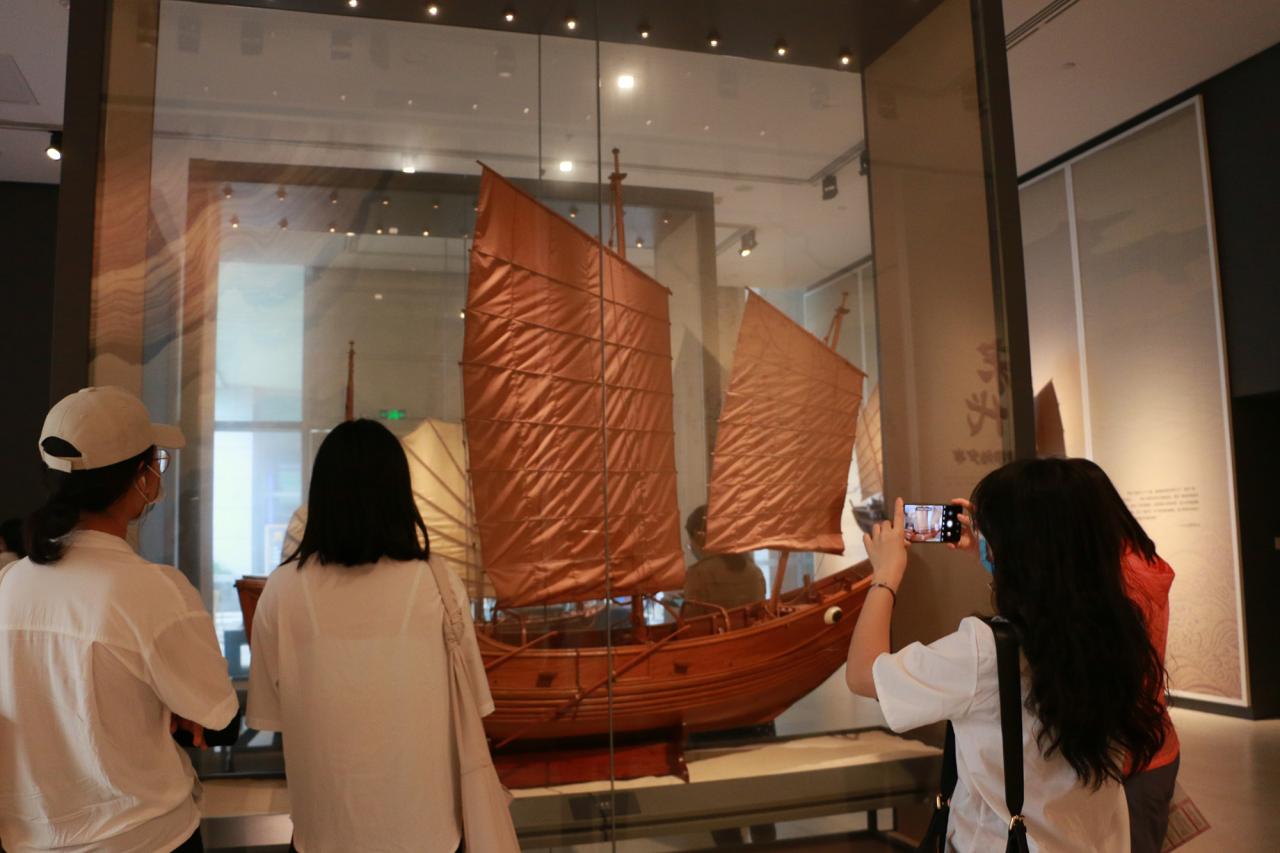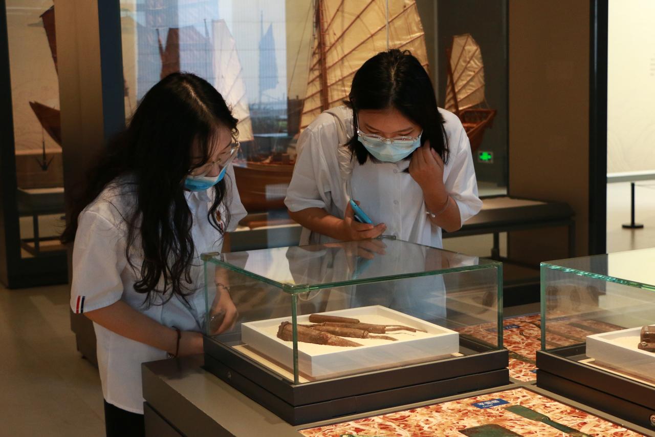 海南省博物馆共拥有九个常设展览,由3个基本陈列、2个专题展览以及非遗“四个一”海南非物质文化遗产陈列构成。自由参观过程中,学员们不仅被生动形象的展厅陈列所吸引,也为海南发展的历史所触动。从“南溟泛舸”中追寻光辉灿烂的海洋文明,从“方外封疆”中窥探历史悠久的人文变迁,从“仙凡之间”中感受独一无二的海岛风情,从非遗“四个一”中遇见活的海南……学员们在博物馆里找到了过去的海南,也必将在自贸港的建设中立足现在的海南、追求未来的海南。最后,全体学员在一楼进行合影留念。