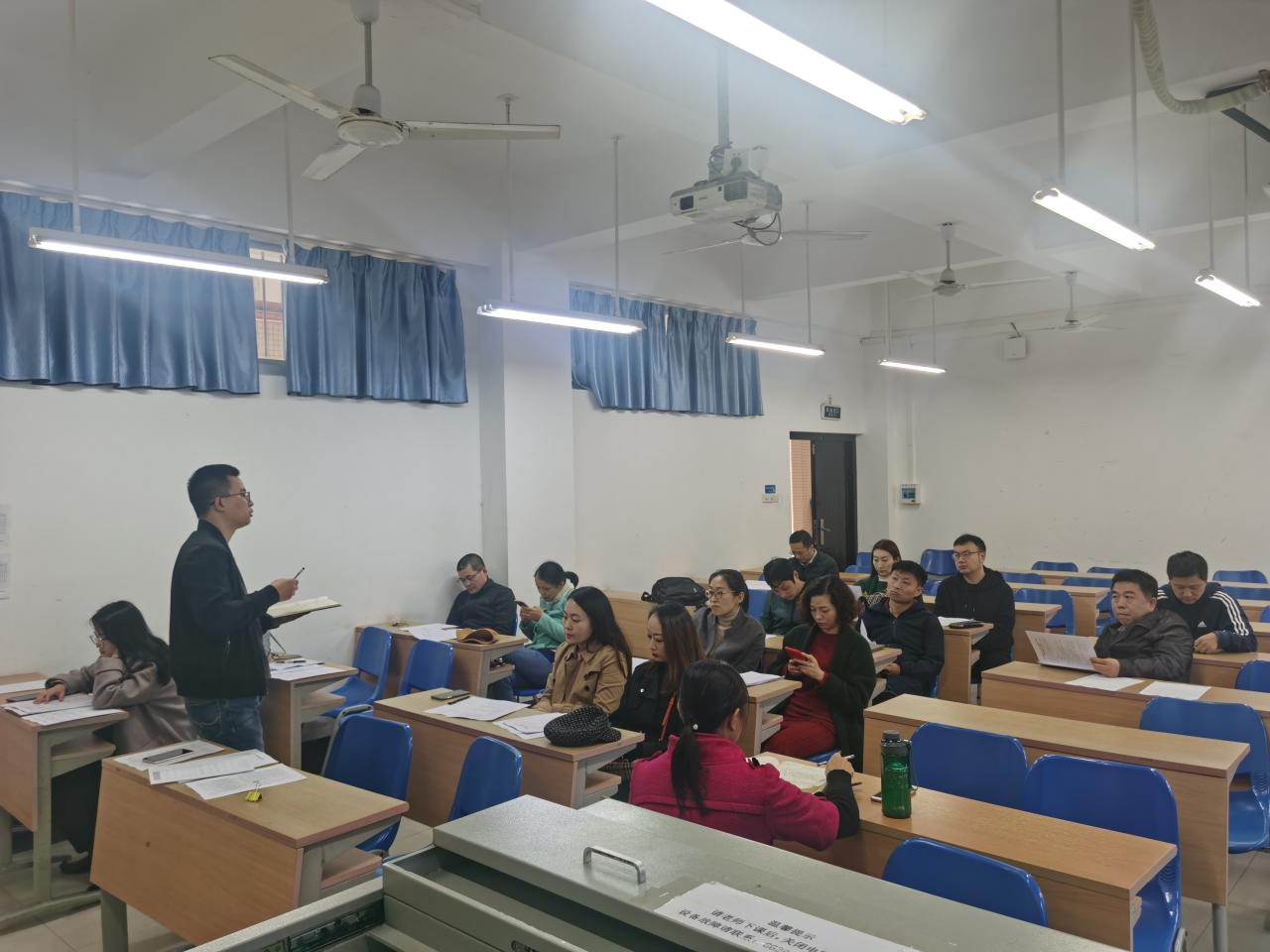 随后,学工办李洁提出了三点问题。第一,她指出在元旦以及寒假期间要切实做好学生安全教育工作、保障校园安全稳定。第二,对于诚信考试问题要召开主题班会。通过让同学们签订诚信考试承诺书,提高同学们的诚信意识,营造公平的考试环境。第三,根据教务处提供的两个学期的成绩,李洁向班主任介绍了学业预警,学业预警分为红、黄、蓝三种,班主任应对过线的学生进行谈话干预。