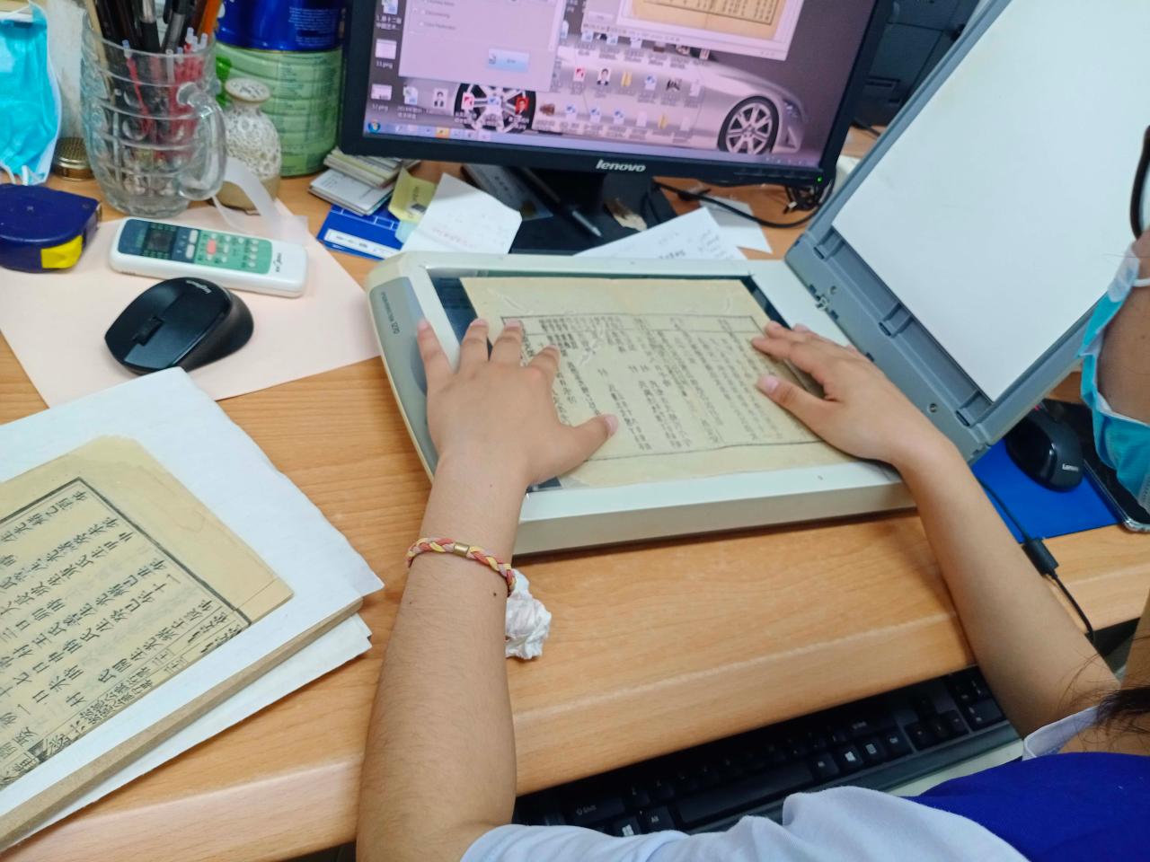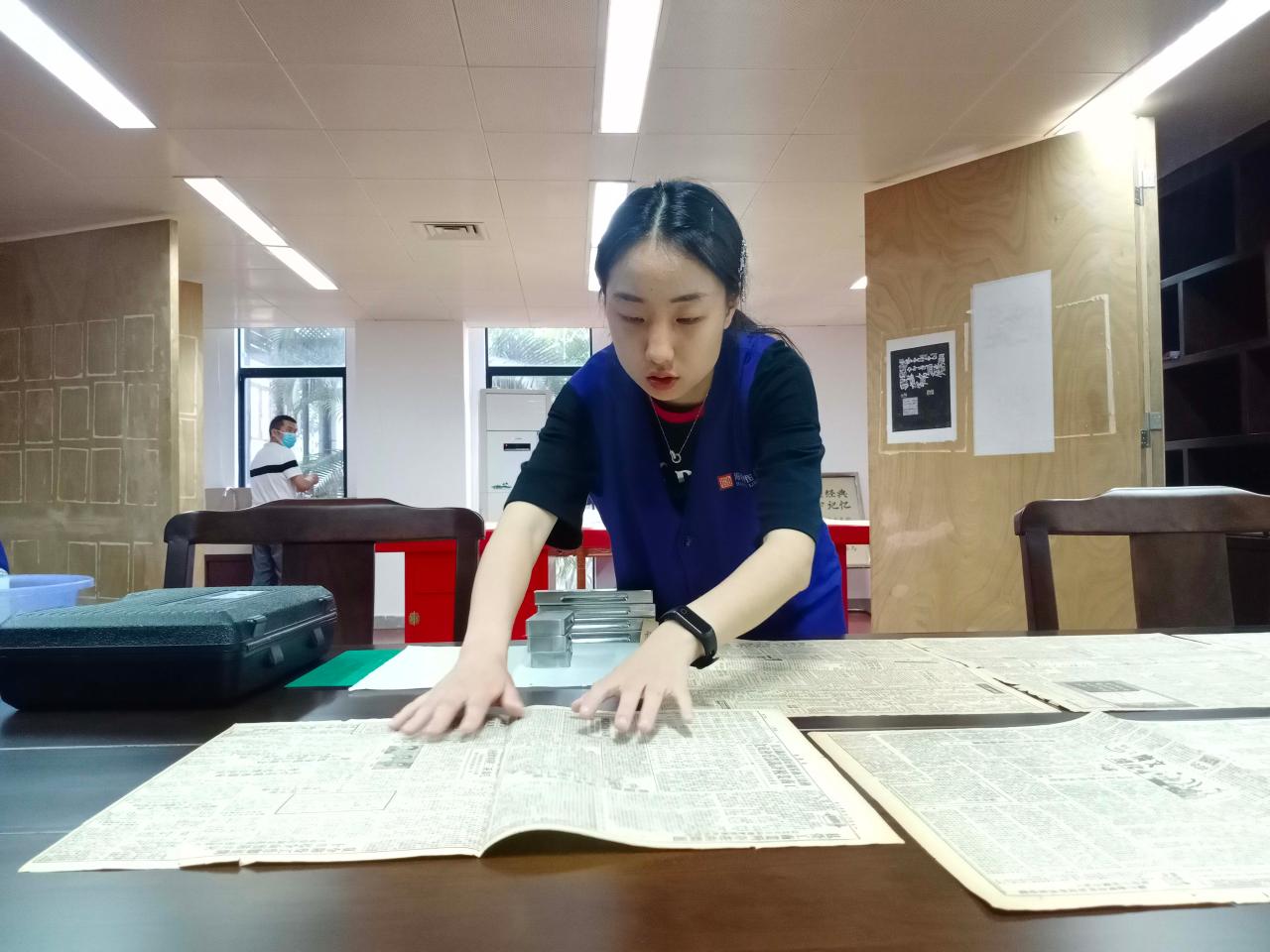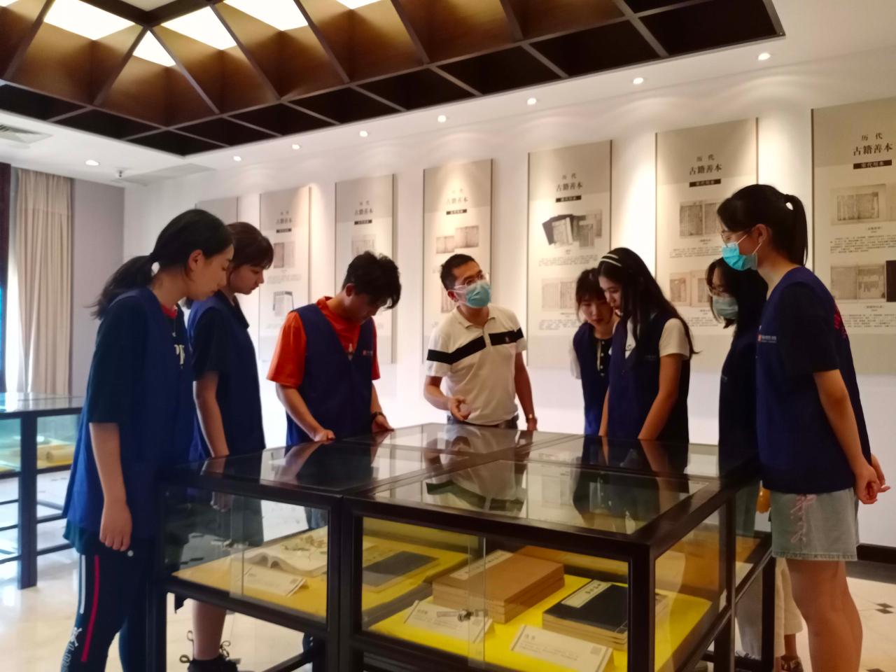 志愿者们大多是首次参加古籍特色保护活动。在活动开始前,志愿者们先由古籍修复黄老师带领前往古籍展览室参观阅览。黄老师为志愿者们详细讲解古籍类别、古籍的印刷装帧等知识,让志愿者们在着手工作前对古籍修复有一个大致了解。参观完毕后,志愿者们前往古籍修复室学习如何保护、修复古籍。下午四点,四名志愿者去往地方文献区搬运书籍,其余志愿者留在古籍修复室,配合老师完成陈旧报刊的刷酸工作。活动过程井然有序,志愿者们对古籍保护表现出浓厚兴趣,现场氛围良好。