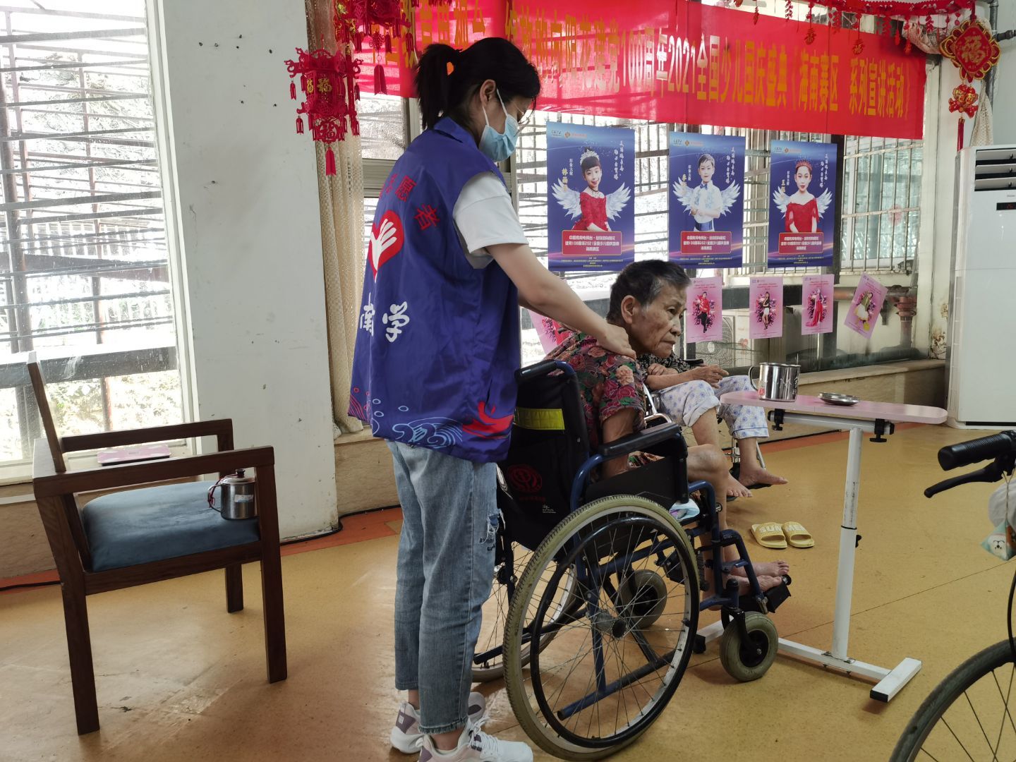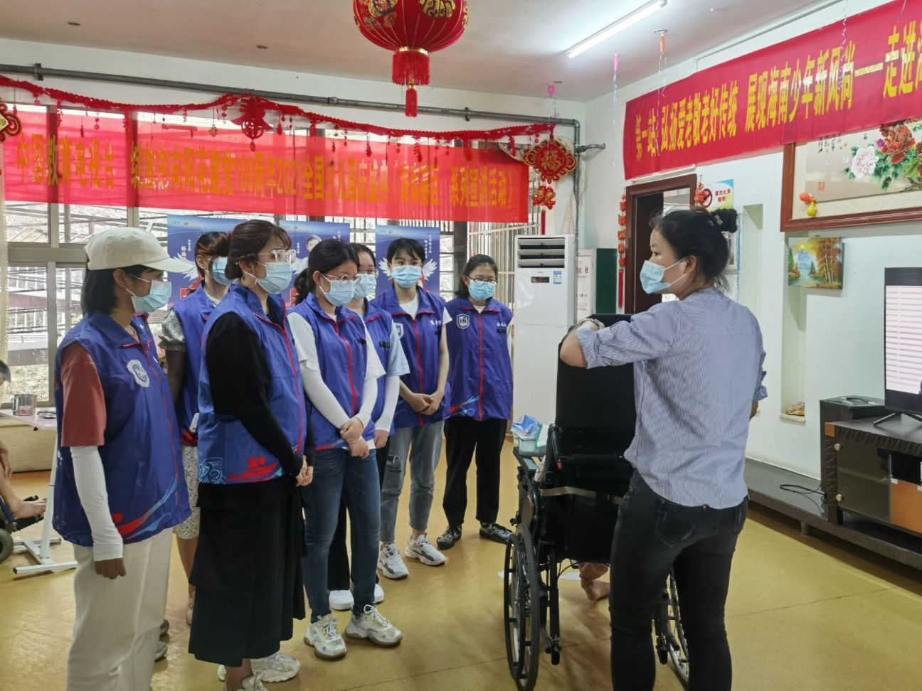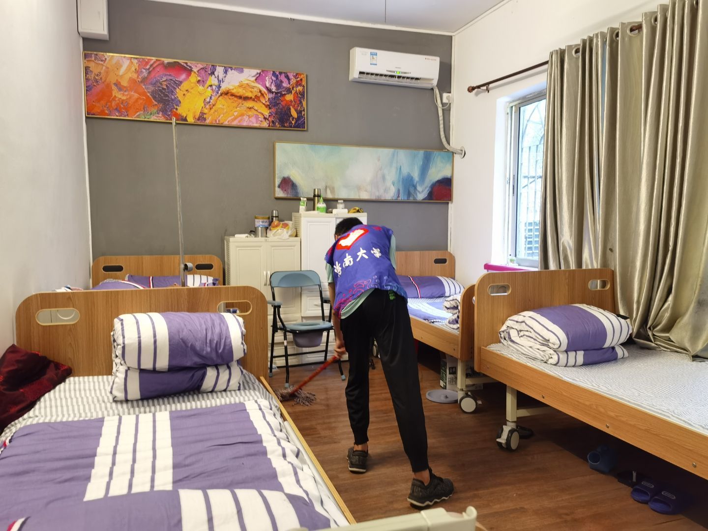 经过短暂的休整,志愿者们再次相聚,集结了更多志同道合的伙伴一同出发。这次的志愿者大多是首次参加老年公寓爱老敬老活动。活动开始前,志愿者在护工人员的指引下出示健康码、进行体温检测、登记相关信息、并佩戴口罩,以保证老人们的健康安全。进入公寓后,志愿者们首先向护工详细地请教了照顾老人的注意事项,然后在护工的指引下,去到不同的楼层陪伴老人、服务老人。有的负责陪在老人身边,替他们按摩、陪他们说话;有的负责打扫卫生,替老人整理内务。临近傍晚是老人们的晚餐时间,志愿者们为老人端来饭菜,耐心地喂给老人们吃。活动进行得非常顺利,气氛十分融洽。