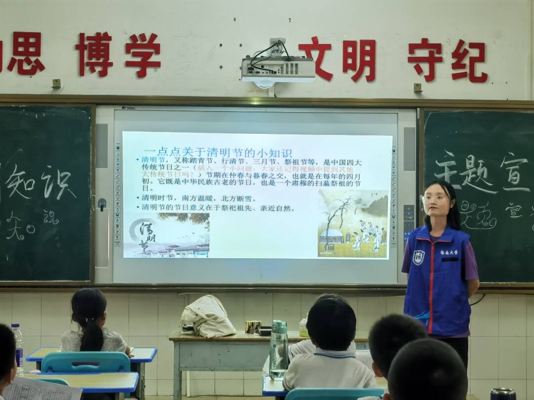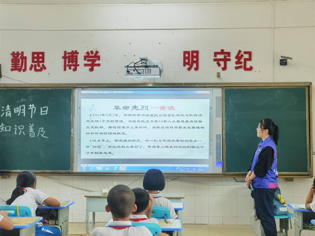 在此次活动中,四名志愿者共分为两组,分别负责三、四年级的教学活动。在课堂上,志愿者为孩子们仔细讲解知识,介绍了与清明节相关的故事、风俗习惯、诗词谚语和英烈壮举,孩子们都认真听讲、积极思考,提出了一系列问题,志愿者则耐心地帮助孩子们解决相关问题。一个个小故事,孩子们都听得津津有味;一个个小视频,孩子们都看得专心致志。在志愿者的引导下,孩子们也积极参与课堂互动,回答志愿者提出的问题,背诵与清明节相关的诗词句,了解到了更多的英雄事迹。课堂整体气氛良好。
