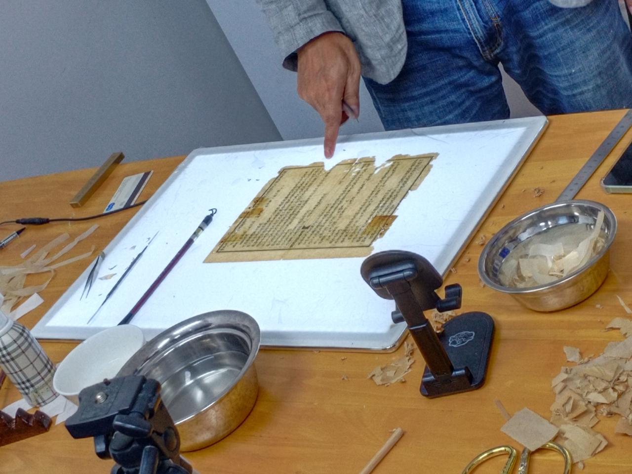 介绍完毕后,志愿者们前往古籍修复室学习如何保护、修复古籍。黄老师向志愿者们展示古籍修复工具,详细讲解了古籍修复的步骤,向志愿者们演示如何将纸张对折、对齐,并且拿出往期学生的印刷作品供志愿者们学习。在此次活动的最后,志愿者们积极提问,黄老师耐心地解答关于古籍修复方面的专业问题,志愿者们收获颇丰。