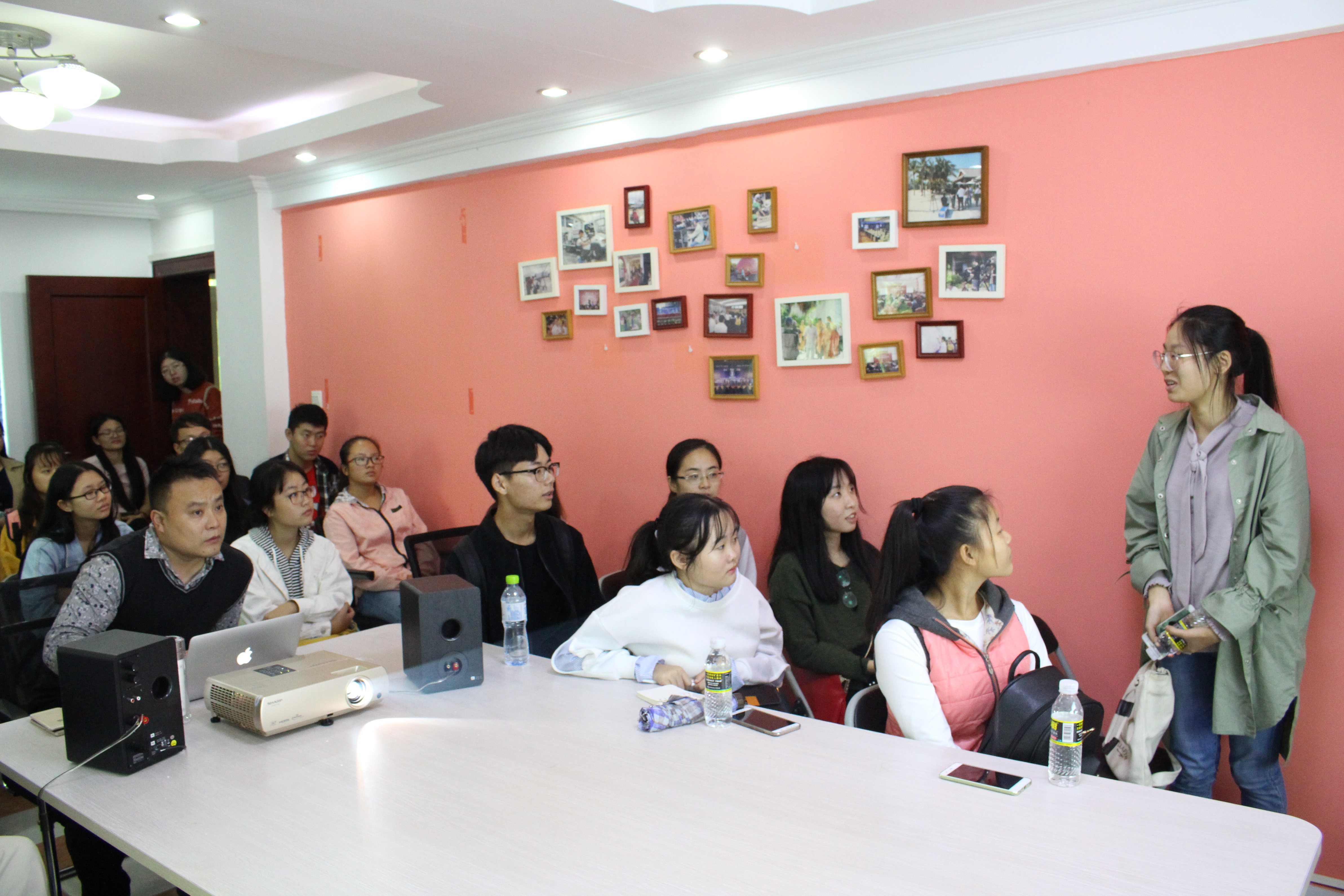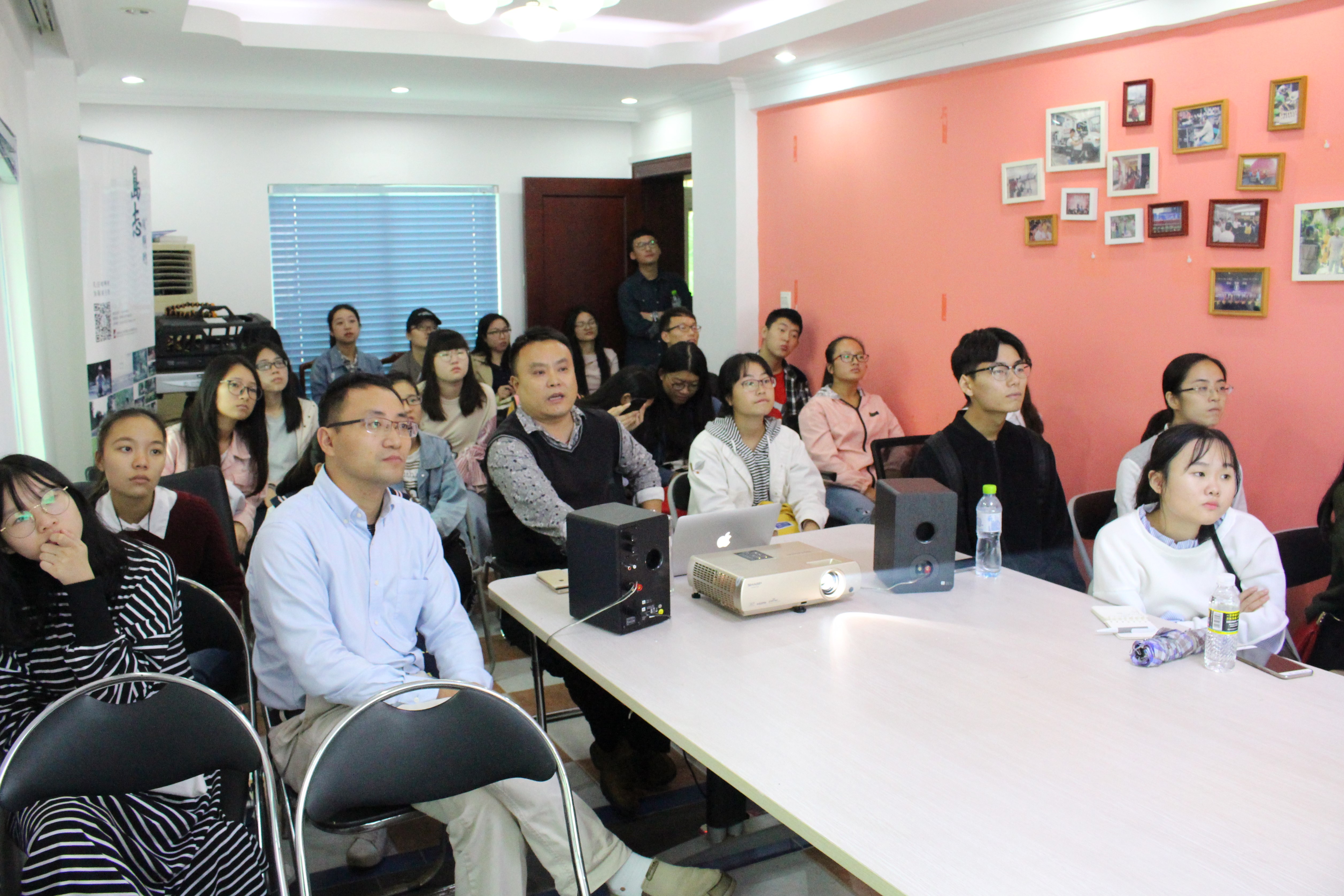 师生。在做简要自我介绍之后,他向同学们讲述了海南文化产业,尤其是影视行业的变化,分析了目前海南影视界存在的问题及影视行业在新时代新背景下的发展前景。随后,魏总通过PPT展示,进一步介绍了海南红山之外影视公司的运营模式和服务对象,并重点讲解了其创立的海南生活“互联网+”系列微记录短片——《咪啊哟》。为了让同学们有更直观的视觉体验,魏总分享了近期主要的影视作品,有《八天》、《一善心光》、《旋风女队》、《玩偶》、《青春当铺》等。其中《青春当铺》是灵犀直播