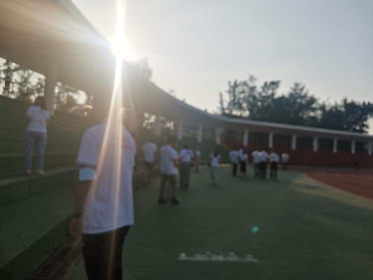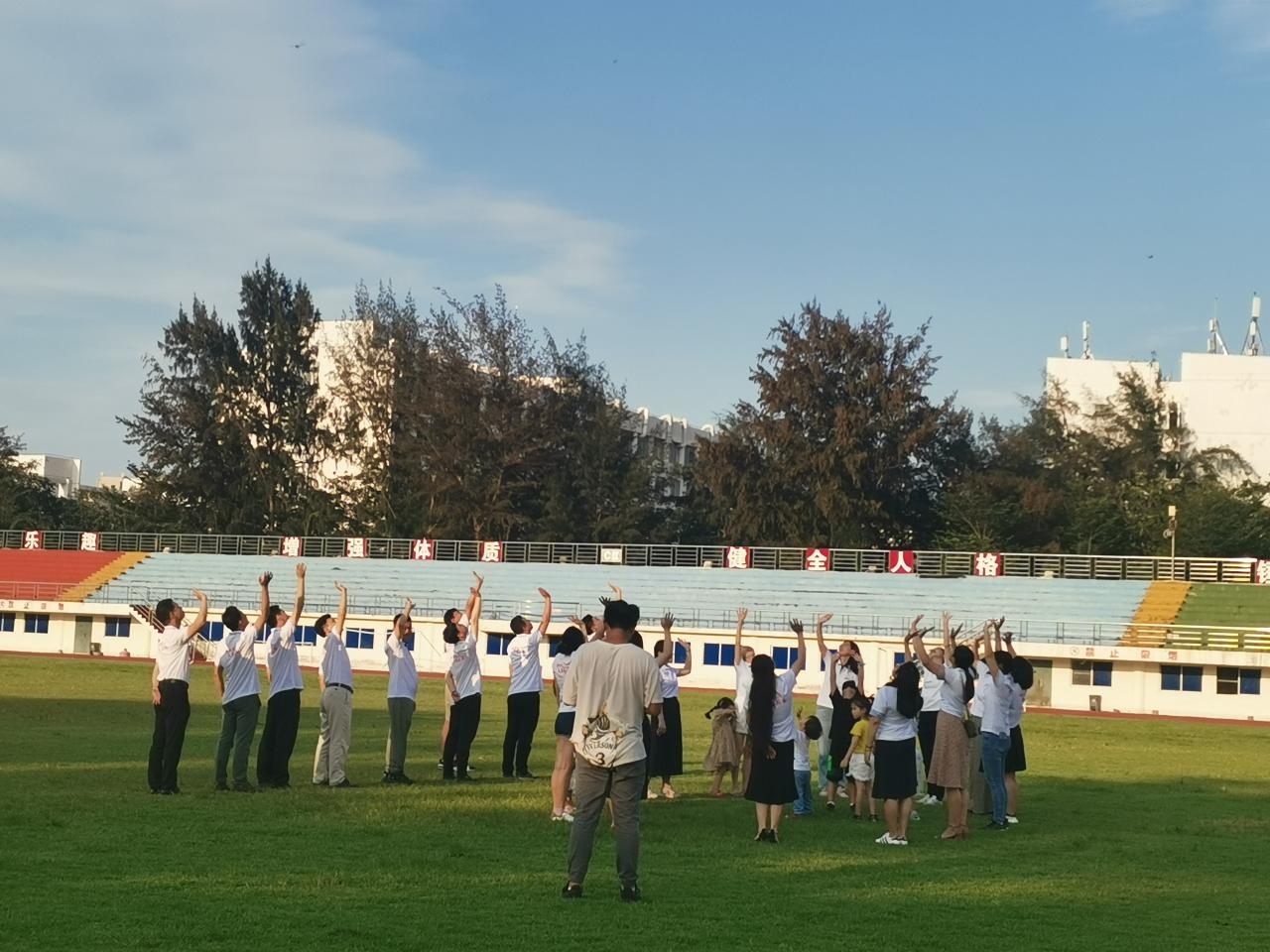 第二站是青春记忆广场。合影结束后,大家来到了第三站——第一田径场。看台上朝着无人机,大家齐声喊出校训“海纳百川,大道致远”;晴空万里,校友们在足球场上站成“10”字队形;青青草坪,校友们相互合影。无人机和摄像机记录下了这一系列举动,青春之风洋溢在整个操场。