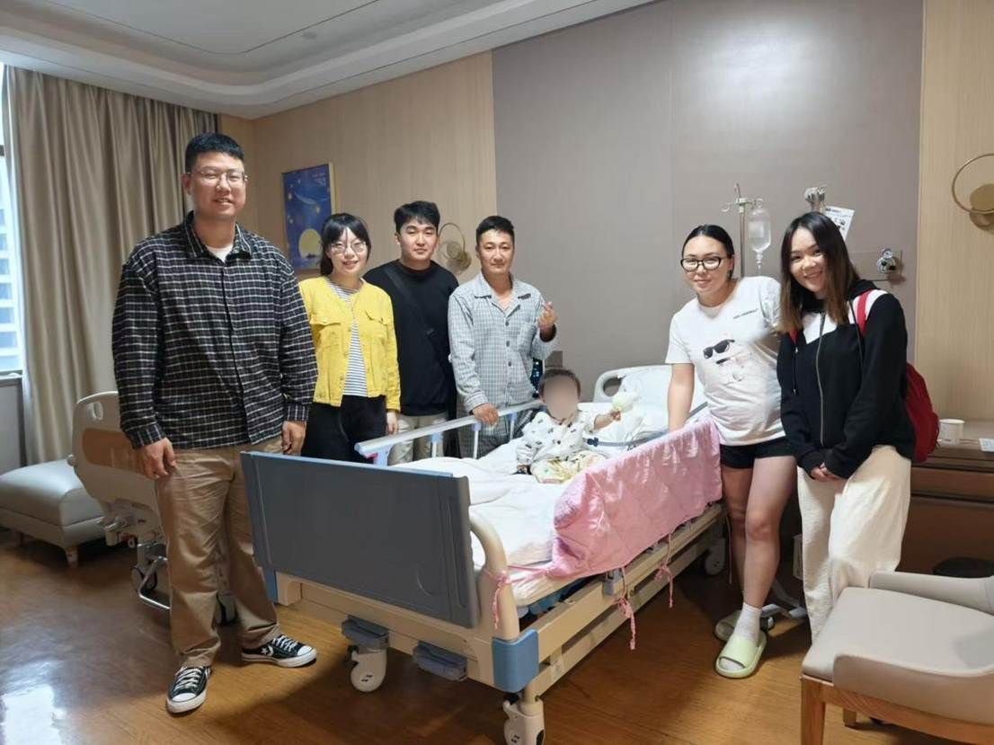 中国古代文学专业硕士研究生郭晟(左一)、汉语言专业本科蒙古国留学生金阳(左三)和芭比(右一)在病房守护患儿。灵犀直播