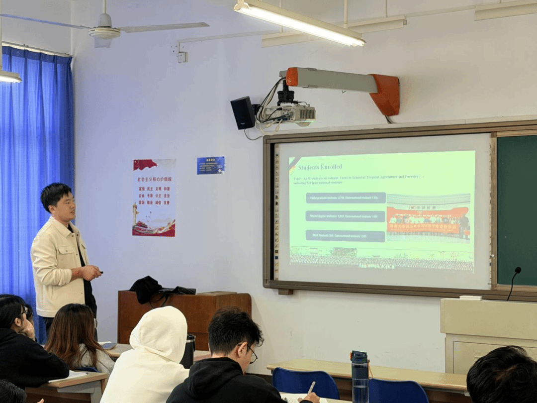 国际商学院国际合作交流中心副主任陈世佩老师向在场学生生动展示了国际商学院的概况。他介绍了面向国际学生的招生专业和学院开展的各类留学生活动,分享了优秀国际校友的相关事迹。